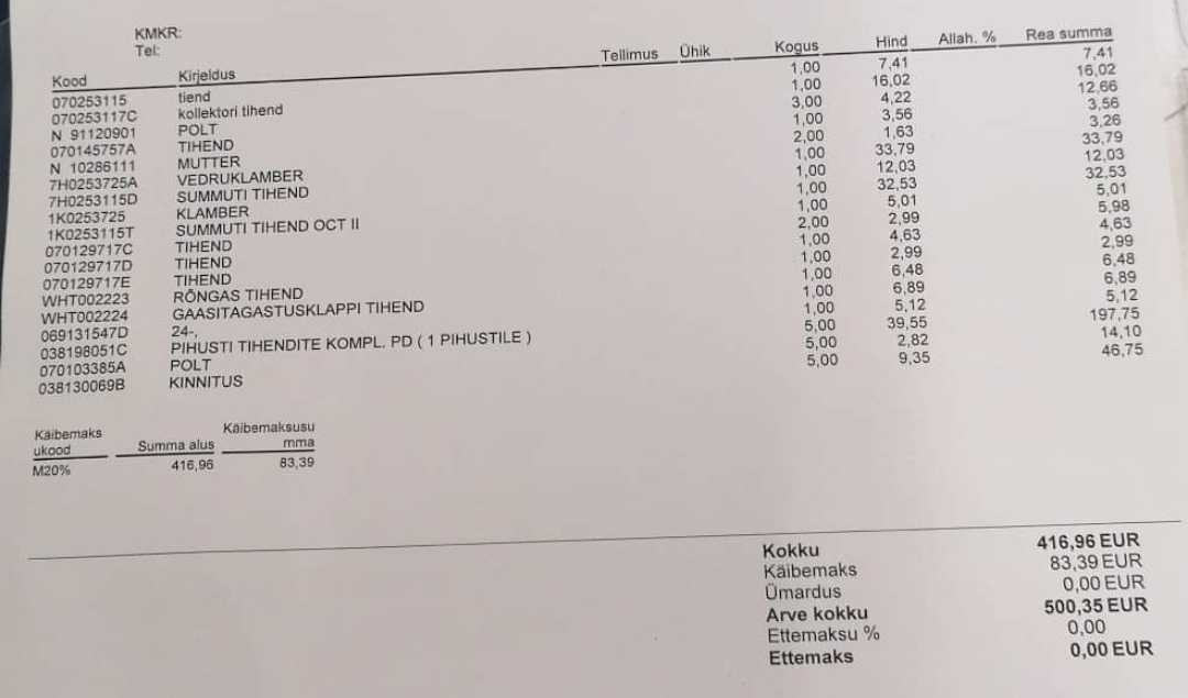 Sain sis täna niipalju teada, et tahmakaga probleemi pole. Kütte trassis kella põhja ei löönud, aga kui tagasivoolu kinni olid pigistanud oli kohe käima läinud. Jääb sis 2 varjanti kas blokk kulunud/mõras või sis pihustid. Kuna need suhteliselt tavalised probleemid sis kust olete endale tellinud , e...