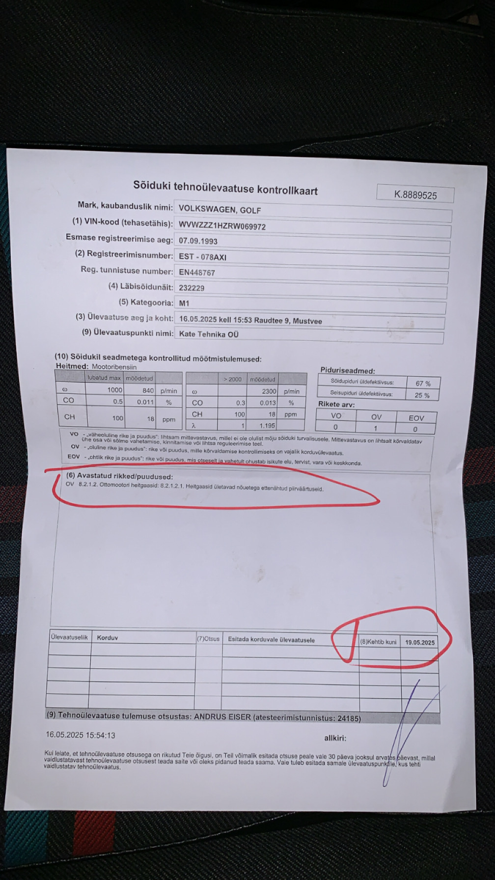 Gaasi andes sinist ei viska, õli ei tarbi, jahutusvedelikku ka mitte. Üks oletus on nüüd see, et kuna sumps veidike lekkis ja polnud õiget vastusurvet siis lambda näitab valesti. Sai uus summuti jooks tellitud. Korduvale ülevaatusele enam ei jõua nkn.
