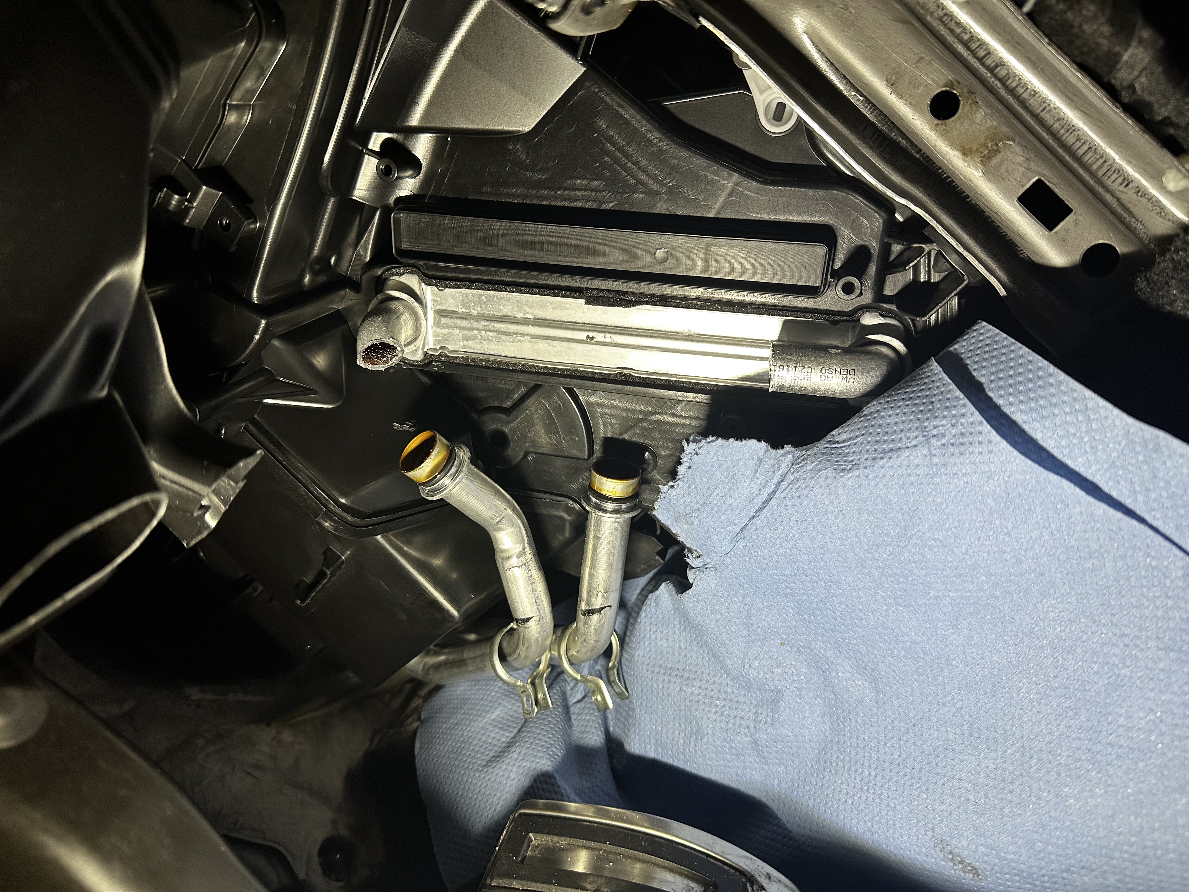 Lõikasin torud märgitud kohtadest labi ning keerutasin nad sealt lahti. Pärast seda oli vaja eemaldada veel jaldagele õhku suunav plastik ning vana radikas oli käes. Uus läks paika ning varuosa kehvast kvaliteedist tingituna oli vaja ühte toru jõuga paika väänata, kuid esialgne ehmatus oli suurem, kui asi lõpuks väärt. Tihendid tegin määrdega kokku eelnevalt ning vanade klambritega ta kokku läks. Pärast koostamist kontrollisin lekete eest ja õnneks midagi säärast ei täheldanud.