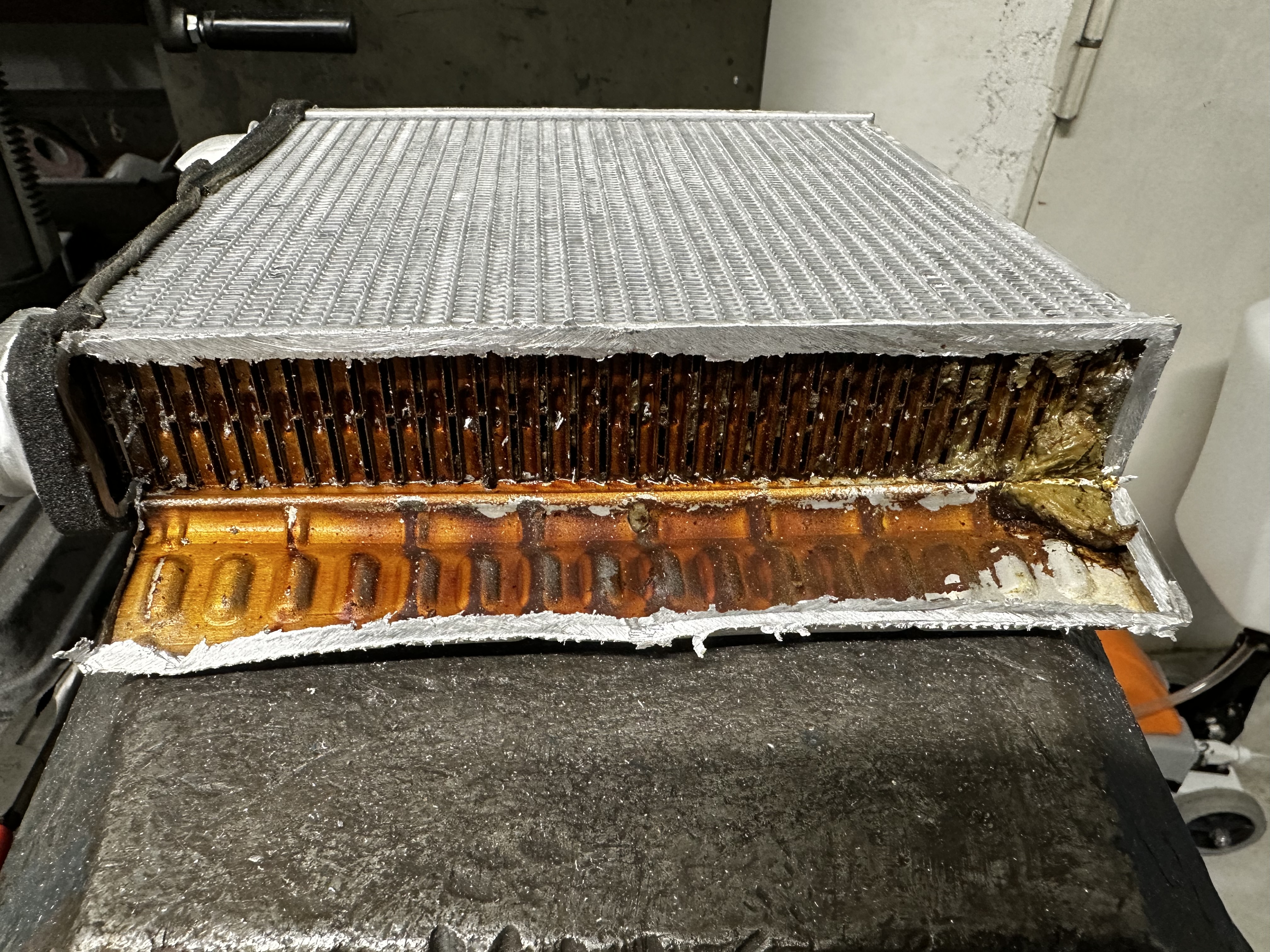 B8 salongi radiaator. Jääb arusaamatuks,kui auto on alles ,,poisike,, ,ja kasutatakse jahutus vedelikku garantii ajal siis kuidas selline ummistus ? Miks imestan. Vanadelt (ca.15,20 a.) vahetatud salongi radikaid lekke pärast. Mitte,et soojust ei tulnud. Need olid ümar torudega radiaatoris. Nüüd pilti vaadates on tegemist lapik torudega radiaatoris. Tehniliselt,mis siis. Küsimine. Kuidas on võimalik kvaliteetse jahutus vedeliku korral radiaatori torud ummistada.